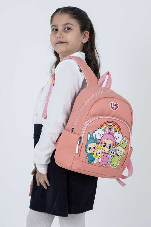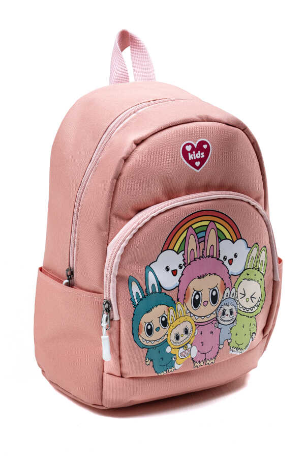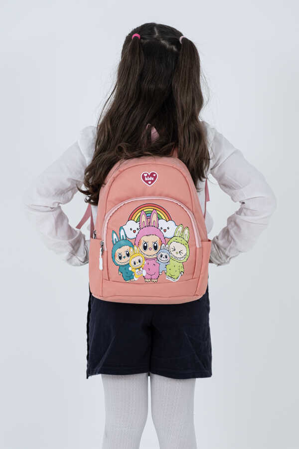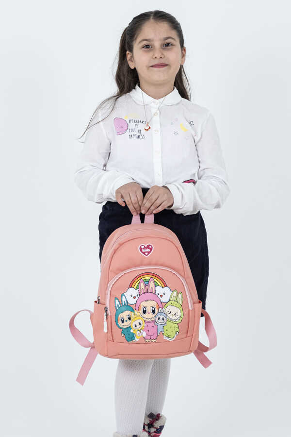 Çocuğunuzun okul yolculuğunu daha eğlenceli hale getiren Labubu figürlerinden ilham alan sevimli tasarımı ile bu pembe kız çocuk sırt çantası, anaokulu ve kreş çağındaki minikler için özel olarak tasarlanmıştır.